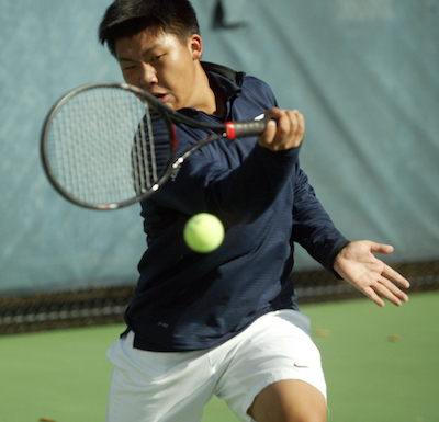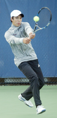 PHOTOS: (Top) Cranbrook Kingswood tennis players pose with their MHSAA championship trophy. (Middle) Holland Christian's JP Avila returns a shot during his run to the No. 1 singles title. (Below) Country Day's Adam Junn returns a shot during his No. 1 doubles final. (Click for more from HighSchoolSportsScene.com.)