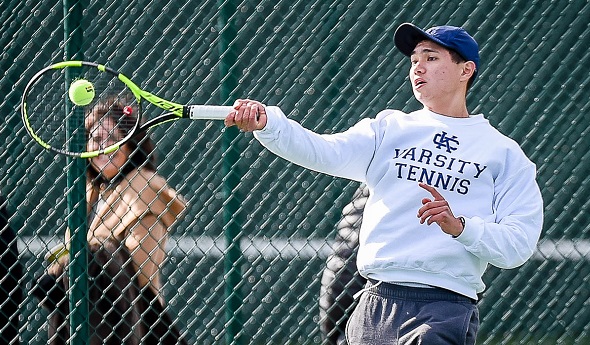 PHOTO: Cranbrook Kingswood’s Lucas Bosch returns a volley during Friday’s first day of competition at the Lower Peninsula Division 3 Finals at Novi. (Photo courtesy of C&G Newspapers.)