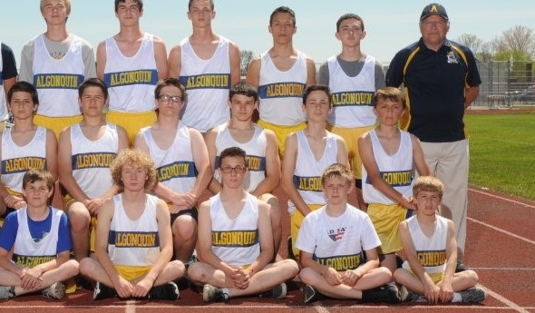 PHOTO: Coach George Richardson, far right and back row, takes a photo with his 2016 Algonquin Middle School boys track & field team. (Photo courtesy of the Algonac athletic department.)