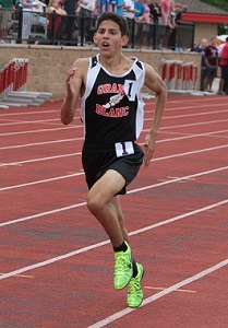 PHOTO: (Top) The East Kentwood boys track and field team poses on the medal stand after claiming the LP Division 1 championship. (Middle) Grant Fisher won the 3,200 in leading Grand Blanc to the team runner-up finish. (Photos by John Brabbs. Click to see more photo coverage from RunMichigan.com.)
