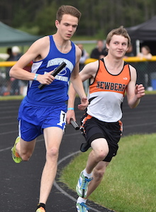 PHOTOS: (Top) Newberry’s anchor runner stretches to finish a meet record run in the 400 relay Saturday. (Middle) Ishpeming’s Grady Kerst passes Newberry’s Kindred Griffis during the 3,200 relay. (Photos by Cara Kamps.)