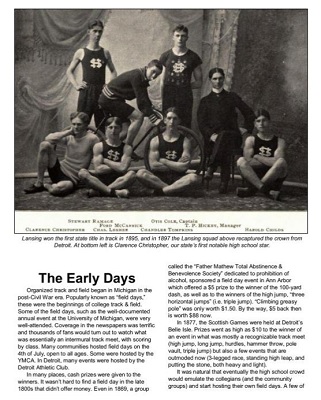 “The Fleet Feet of Spring” is available from Amazon for $24.99. The first 268 pages are filled with stories of every meet dating back to events conducted by the Michigan Inter-School Athletic Association. The next 170 pages are packed with every championship listing imaginable, including names of contributors to winning relays through the years and a list of total individual champions per school.
