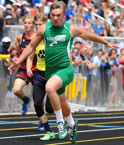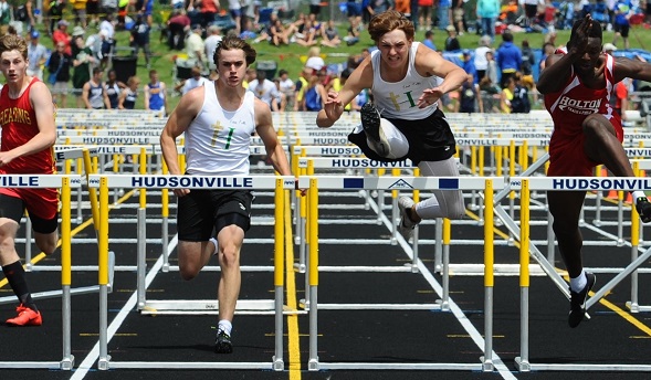 PHOTOS: (Top) Hackett’s Heath Baldwin and Gus Magnell, second and third from left, respectively, break through for two of top three places in the 110 hurdles. (Middle) Sand Creek’s Alec Muck pushes toward the finish line for one of his sprint championships Saturday. (Click for more from RunMichigan.com.)