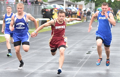 PHOTOS: (Top) Ishpeming’s Kyle Pruett cruises through the rain during the 3,200 relay; his team finished second in the race. (Middle) Hancock’s Alex Dewald crosses first in the 100. (Photos by Cara Kamps.)