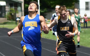 PHOTOS: (Top) Ishpeming Gavin Sundberg leads off the 800-meter relay. (Middle) Stephenson's Montell Glover, left, outleans Iron Mountain's Michael Kulas in the 400. (Photos by Cara Kamps. Click for more at RunMichigan.com.)