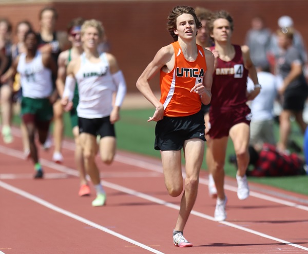 PHOTOS (Top) Detroit U-D Jesuit completes an exchange during the 1,600 relay Saturday at Rockford High School. (Middle) Utica’s Trent McFarland surges toward the finish of the 800. (Click for more from Jamie McNinch/Run Michigan.)