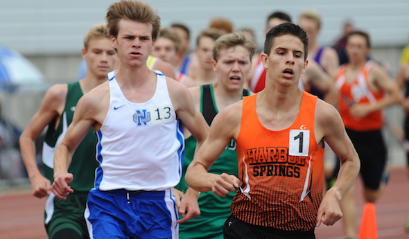 PHOTOS: (Top) Harbor Springs’ Jeremy Kloss leads the pack during last season’s 1,600 championship race at the LP Division 4 Finals. (Middle) Kloss crosses first to win the 3,200 title. (Click for more from RunMichigan.com.)