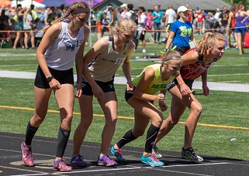 PHOTOS: (Top) The O’Malley twins, Klaudia and Keegan, run their respective events during last season’s Lower Peninsula Division 3 Finals. (Middle) Klaudia O’Malley, second from right, gets ready to start the 800. (Click to see more from RunMichigan.com.)