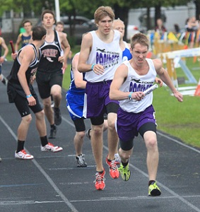 PHOTOS: (Top) Three North Dickinson hurdlers (including eventual winner Tim Hruska, far right) made up nearly half the field of the 110 hurdles final. (Middle) Pickford won the 1,600 relay and finished second overall in U.P. Division 2. (Photo by Paul Gerard. Click to see more photo coverage from RunMichigan.com.)
