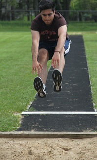 PHOTOS: (Top) Khaled Bukhamseen rounds a turn during a recent Parchment track practice. (Middle top) Bukhamseen, Parchment coach Matt Hodgson, teammate Donavan Hodgson. (Middle below) Bukhamseen trains in the long jump. (Below) David Person, Kira Griggs. (Photos by Pam Shebest.)
