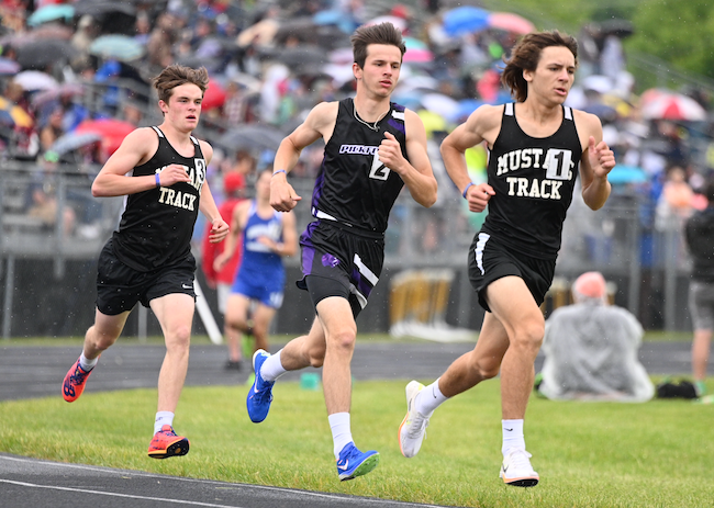 PHOTOS (Top) Pickford's Jacob Mitchell hands off the baton to Eli MacDonald for the last leg of the 3,200 relay Saturday at Kingsford. (Middle) During a rainy 1,600, Munising's Dan Goss (1) leads the race with Pickford's Hayden Hagen (2) and Munising's Trevor Nolan (3) right behind him. (Click for more from Cara Kamps/RunMichigan.com.)