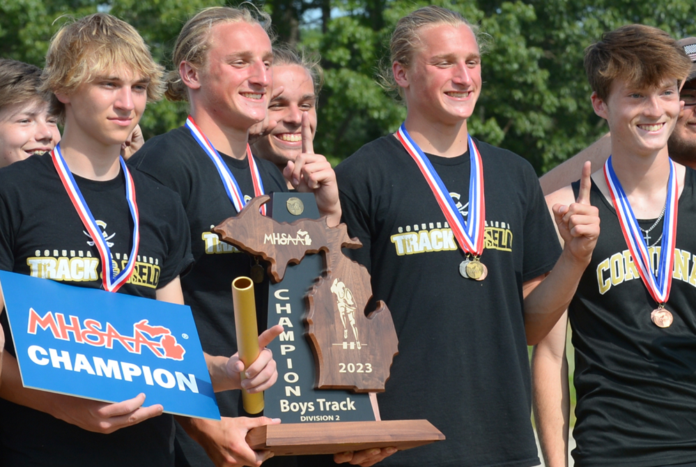 PHOTO Corunna, including twins Tarick and Wyatt Bower, celebrates its LPD2 team championship last season. (Photo by Dave McCauley/RunMichigan.com.)