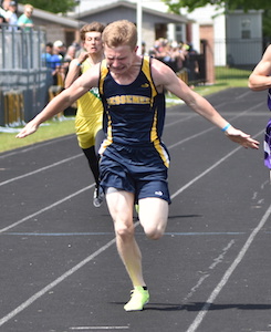 PHOTOS: (Top) Rapid River’s Luke Gustafson runs his leg of the 1,600 relay Saturday. (Middle) Bessemer’s Brayden Tomes stretches for the win in the 200. (Photos by Cara Kamps.)