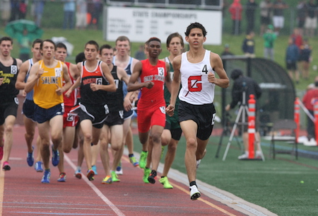 PHOTOS: (Top) Jaron Flournoy (middle) stays ahead of the field during a championship-winning sprint Saturday. (Middle) Grant Fisher set an MHSAA all-Finals record in the 1,600. (Click to see more from RunMichigan.com. Photos by John Brabbs.)