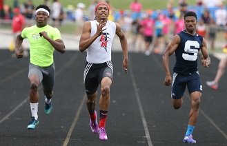 PHOTOS: (Top) East Kentwood's Khance Meyers breaks away from the field during last season's 200-meter preliminaries at the Lower Peninsula Division 1 Finals. (Middle) Meyers stays a step ahead of Oak Park's Miles Daniel (left) and Saginaw Heritage's Sean Beckom II during last season's 100 championship race. (Photos by Carter Sherline/RunMichigan.com.)