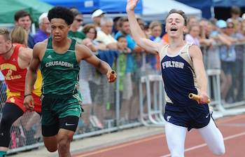 PHOTOS: (Top) Whittemore-Prescott runners pass the baton during a relay Saturday at Houseman Field. (Middle) Muskegon Catholic Central and Fulton-Middleton anchors cross the finish line during the 400 relay. (Photos by Dave McCauley/RunMichigan.com.)