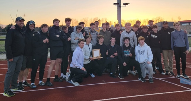 PHOTO: Zeeland West athletes hoist their championship trophy Saturday at Grand Rapids' Houseman Stadium. (Click to see more from RunMichigan.com.)