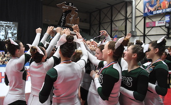 PHOTOS: (Top) Gibraltar Carlson performs part of a top-scoring routine during Saturday’s title run. (Middle) Allen Park celebrates its runner-up finish.