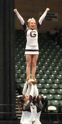 PHOTOS: (Top) Rochester performs during Friday's Division 1 Final at the DeltaPlex. (Middle) A Grandville cheerleader is raised by her teammates during their round.