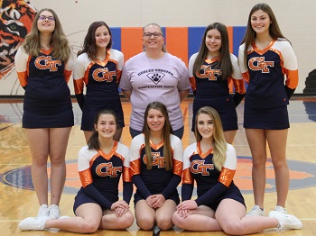 PHOTOS: (Top) Gobles’ seven-member competitive cheer team participated in its first meet this season Saturday at Paw Paw. (Middle) Clockwise from top left: Seniors Annika Brunner and Lauren Krieger, coach Nicole Durr and senior Brielyn Lisowski. (Below) Gobles is aiming to take the next tournament step and reach the MHSAA Finals. (Photos by Pam Shebest.)