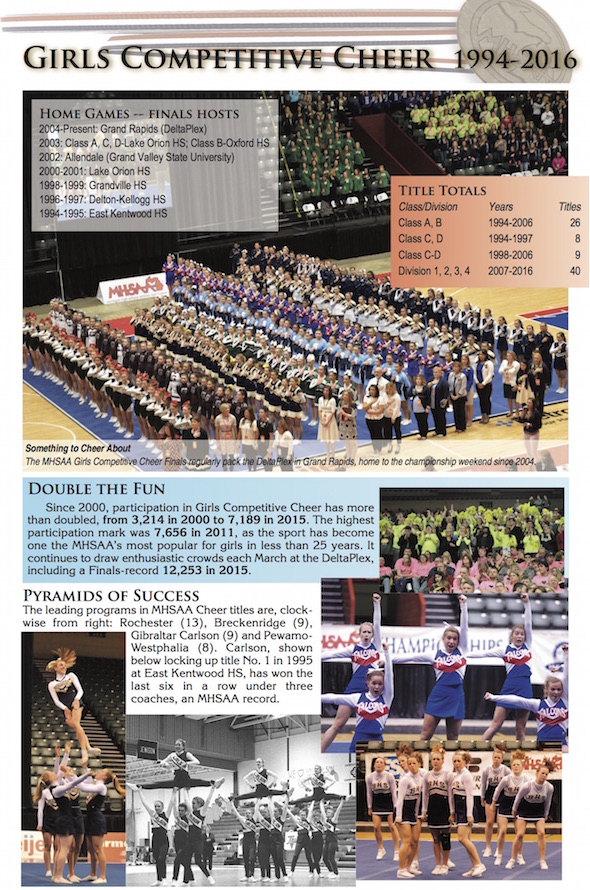 Few sports stack fans to the rafters like the MHSAA Competitive Cheer Finals, which set attendance records for 12 straight seasons through 2015 in growing to become one of the state's most well-cheered for sports at the championship level.