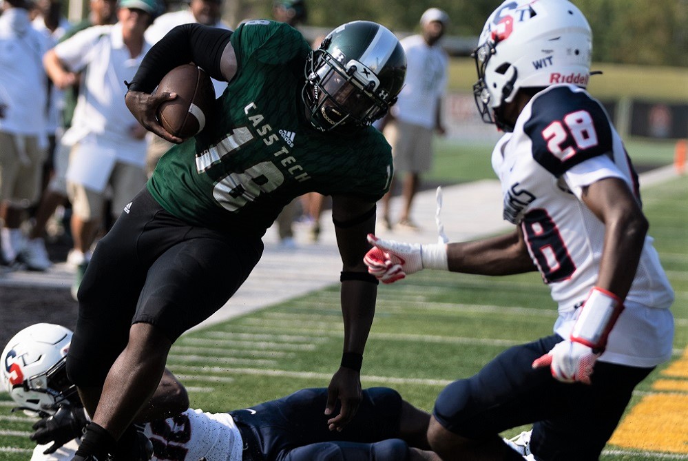 PHOTO: Detroit Cass Tech’s Julius Faulkner (18) breaks a tackle and prepares to take on another defender during his team’s Week 1 win against Southfield Arts & Technology. (Photo by Quintin Love Jr.)