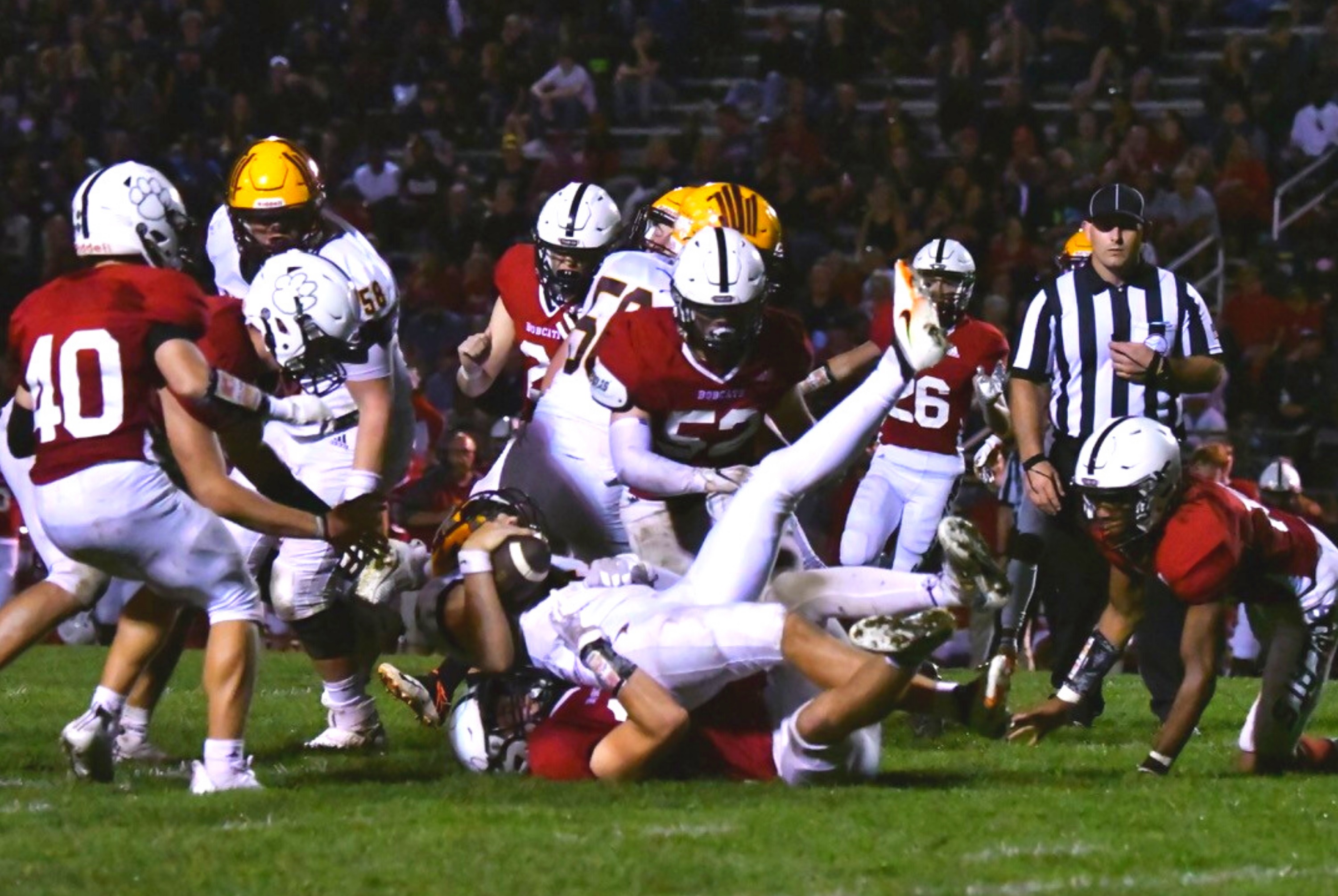PHOTO: A swarm of Grand Blanc defenders bring a Davison ball carrier to the ground Friday. (Photo by Terry Lyons.)