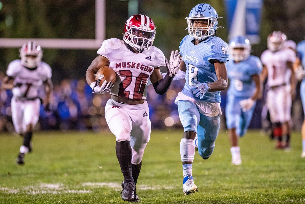 PHOTO Muskegon pulled away from rival Mona Shores during the second half of Friday's 49-28 win. (Photo courtesy of Local Sports Journal.)