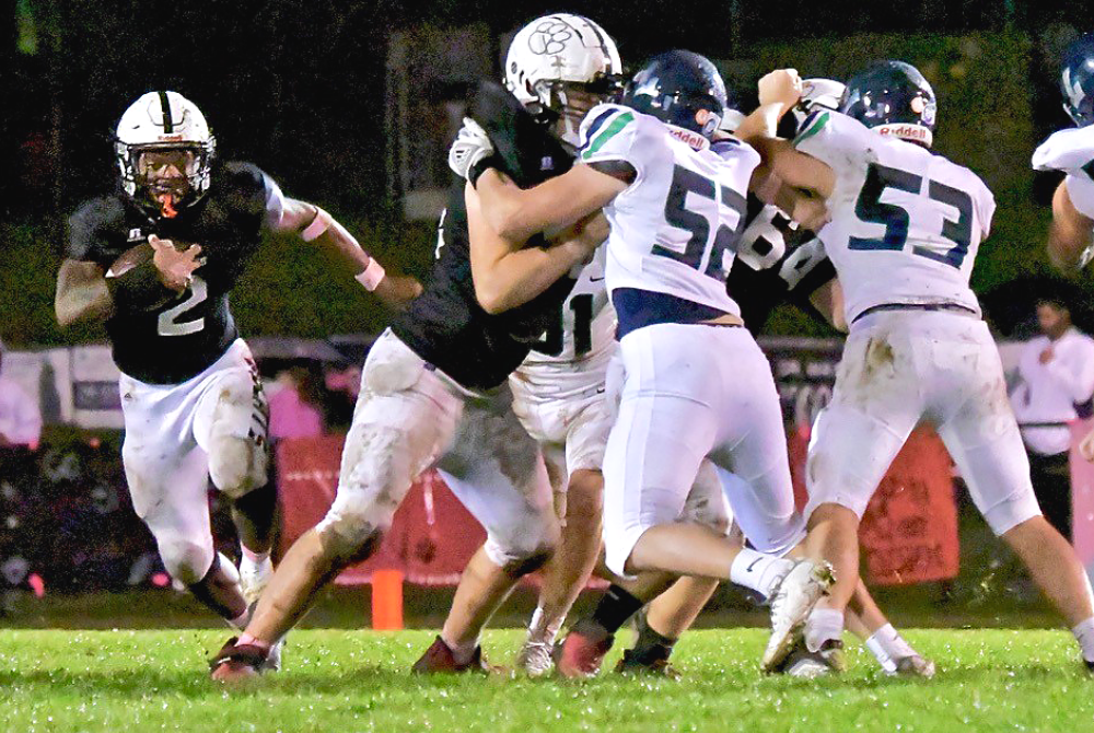 PHOTOS (Top) Grand Blanc's Elijah Jackson-Anderson (2) charges into the Lapeer defense behind his blockers Friday. (Middle) A Pewamo-Westphalia ball carrier is wrapped up by a Bath defender during the Pirates' 41-0 win. (Below) A Vestaburg defender wraps up a Marion ball carrier. (Photos by Terry Lyons, Christine McCallister, and High School Sports Scene, respectively.)
