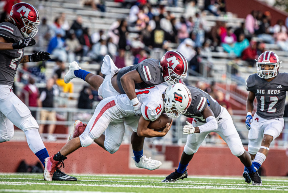 PHOTO A pair of Muskegon defenders make a tackle against Holland this season. (Photo by Tim Reilly.)