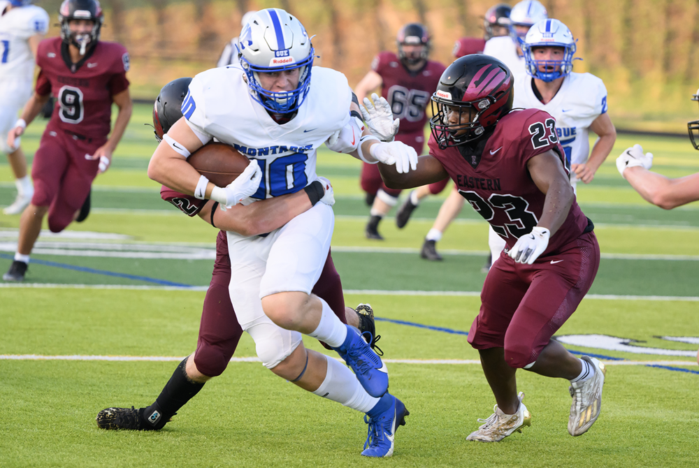 PHOTO A Montague ball carrier attempts to break free last week from multiple Forest Hills Eastern defenders, including Jordan Shabazz (23). FHE won the opener 48-7. (Photo by Michigan Sports Photo.)