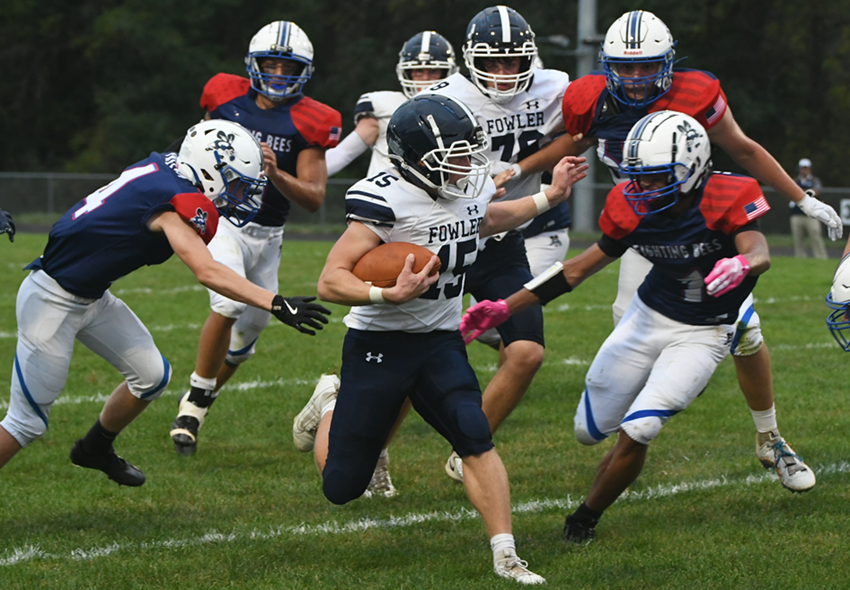 PHOTOS (Top) Linden quarterback Dylan Dreasky (7) hands off during his team’s 14-13 win over previously-undefeated Flushing on Friday. (Middle) Fowler’s Ford Phillips (15) breaks into an opening but with Bath’s Isiah Delacruz (1) closing in. The Eagles won 41-0. (Below) DeWitt’s Tyler Dusseau (65) and Max Holtz (5) bring down a ball carrier from Hurricane, WV. (Top photo by Terry Lyons, middle photo by John Johnson, and below photo by Max McCallister.)