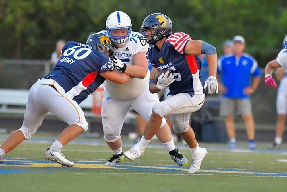 PHOTO Goodrich's Chase Burnett (25) follows teammate Gavin Sukup's block during a Week 3 win over Lake Fenton. (Photo by Terry Lyons.)
