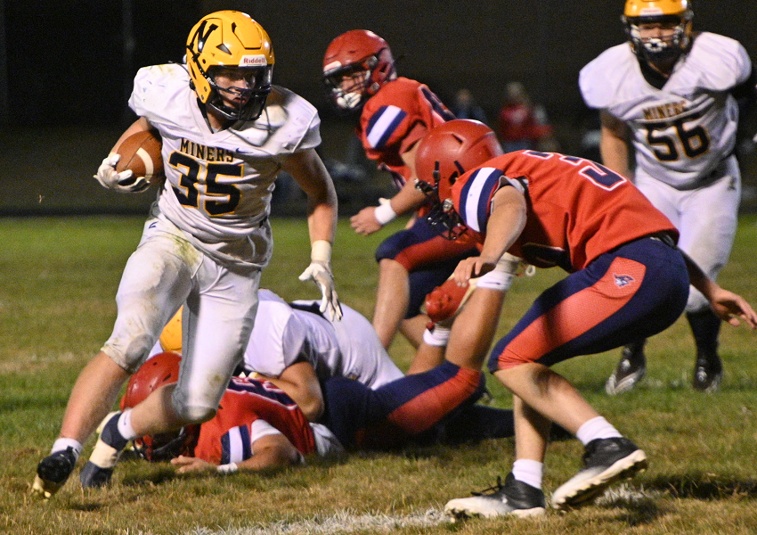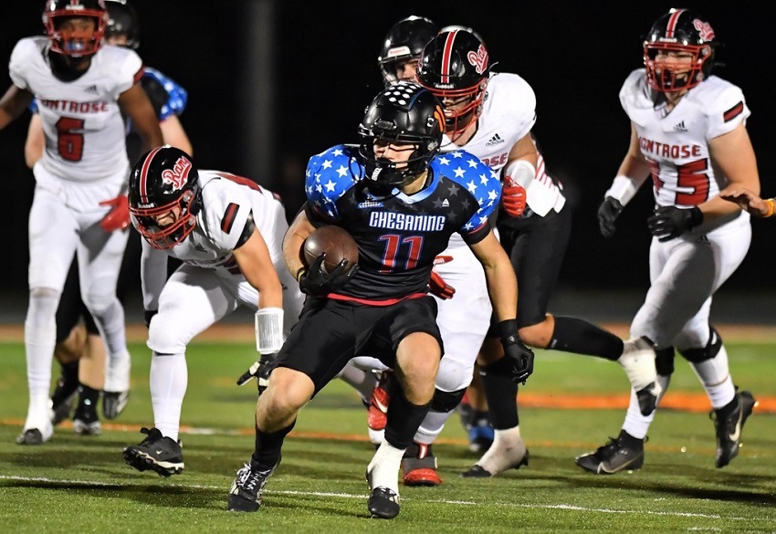 PHOTOS (Top) Fowler's Jacob Halfmann pulls away from a Pewamo-Westphalia defender Friday. (Middle) Chesaning's Brayden Florian (11) finds a seam during his team's 50-0 win over Montrose. (Below) c (Top photo by Jim Pivarnik. Chesaning/Montrose photo by Terry Lyons. Negaunee/Westwood photo by Cara Kamps.)