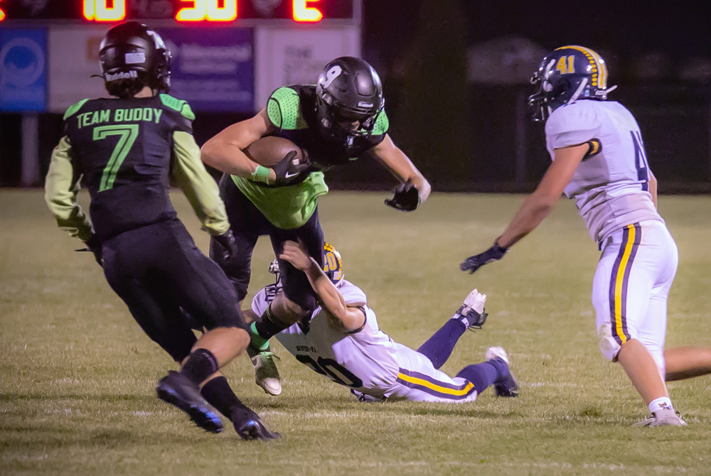 PHOTO A pair of Ovid-Elsie defenders close in on New Lothrop’s Michael Schachter (9) during the Marauders’ 42-0 Week 8 victory. (Photo by Click by Christine McCallister.)