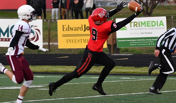 PHOTO: Marquette’s Justin Jurmu tries to pull in a pass from quarterback Austin Ridl, with Menominee’s Brady Waara trailing. (Photo by Cara Kamps.)