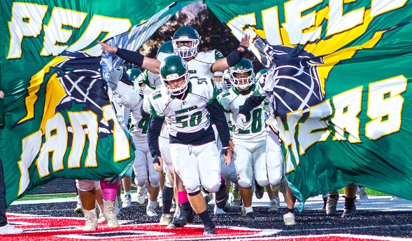 PHOTO: Battle Creek Pennfield takes the field at the start of a 49-7 win over Jackson Northwest on Friday. (Photo by Scott Mapes.)