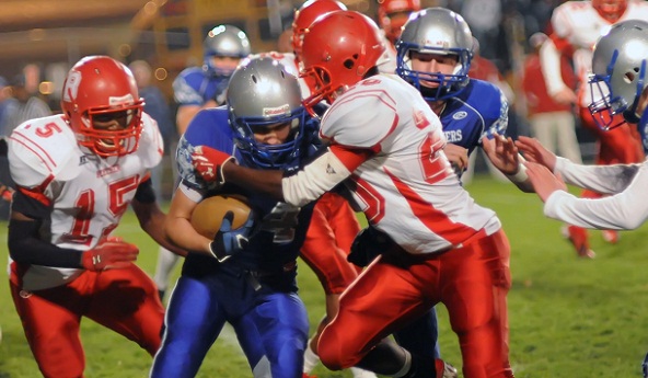 PHOTO: (Top) Beecher linebacker Tyrik Wicks (20) wraps up Saginaw Nouvel's Ryan Sullivan (4) as sophomore Mike Herd (15) also pursues during last weekend's Regional Final. (Middle) Flint Beecher coach Courtney Hawkins, who also played at Michigan State and in the NFL. (Click to see more from the Regional Final at HighSchoolSportsScene.com.)
