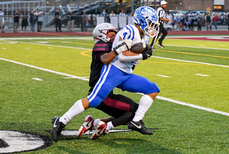 PHOTOS (Top) Gibraltar Carlson quarterback Joe Krolak considers his best option during last week’s win over Southgate Anderson. (Middle) Carlson coach Jason Gendron pumps up his team during a practice. (Below) The Marauders’ Avery Ortiz drags a defender downfield. (Game photos by Kim Britt; practice photo by Niles Kruger/Monroe News.)