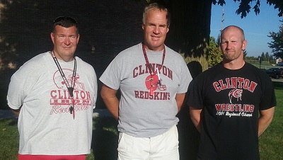 PHOTOS: (Top) Clinton’s Steve Laurell (left) and Cordell Hernandez, shown this season against Manchester, are two of the top returning players from the 2015 Division 6 runner-up. (Middle) From left: Clinton assistant coach John Schuler, head coach Scott McNitt, defensive coordinator Jeremy Fielder. (Below) Clinton also returns multiple contributors from the offensive line that took on Ithaca during last season's Final at Ford Field. (Top photo by John Discher/Adrian Daily Telegram.)