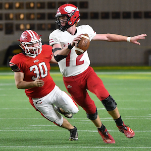 PHOTOS (Top) Pontiac Notre Dame Prep quarterback Sam Stowe (15) throws a pass during the Division 5 Final while protected by lineman Adrian Fernandez (56). (Middle) Fighting Irish coach Pat Fox leads his team – including Henry Ewles (72) and Brody Sink (7) – off the field.