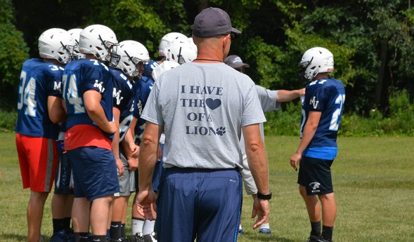 PHOTOS: (Top) Maple Valley huddles during offensive drills at Wednesday afternoon’s practice. (Middle) Coach Marty Martin leads the Lions through agility work. (Below) Maple Valley will wear new helmets this fall thanks in part to community donations.
