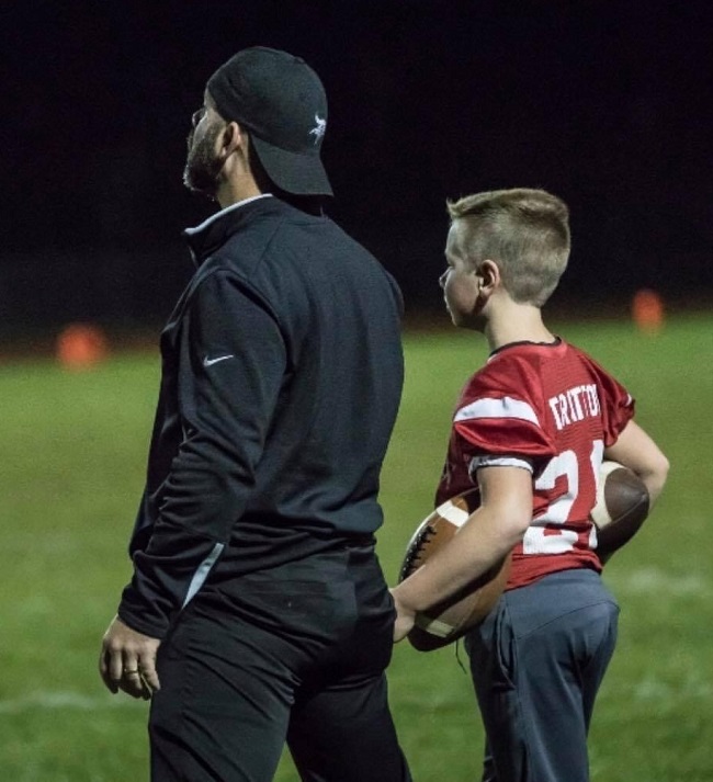 PHOTOS (Top) Whitehall quarterback Kyle Stratton embraces his father Keith after a game this season. (Middle) Keith Stratton, left, and Kyle man the sidelines during Kyle’s younger years supporting the program. (Photos courtesy of Jodi Stratton.)