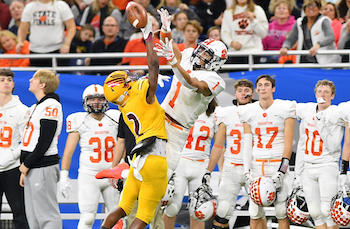 PHOTOS: (Top) Davison celebrates its first MHSAA Football Finals championship Saturday at Ford Field. (Middle) Brighton’s Ruben Salinas (1) keeps his eyes on a pass as Davison’s JayLen Murray Flowers works to deflect it.