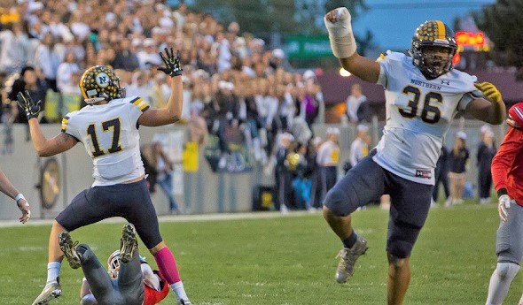 PHOTO: Port Huron Northern’s Braiden McGregor (17) and Maurice Powell celebrate a big play during the Oct. 5 21-14 win over Port Huron. (Photo by Delta Imaging.)