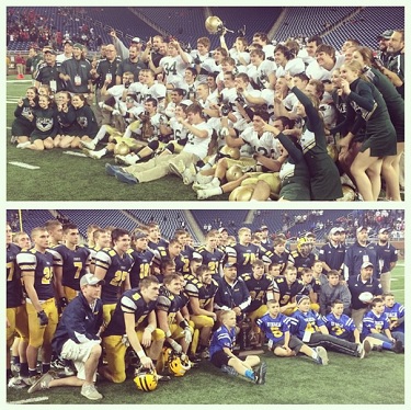 The Wolves took over as holders of the longest MHSAA winning streak at 27 straight after claiming a second consecutive Division 1 championship. Junior running back Nolan Eriksen followed up the starring 2013 Finals performance of his brother Ian with 28 carries for 172 yards and three touchdowns. Saline finished 12-2 in making its first MHSAA championship game. Click to read more.