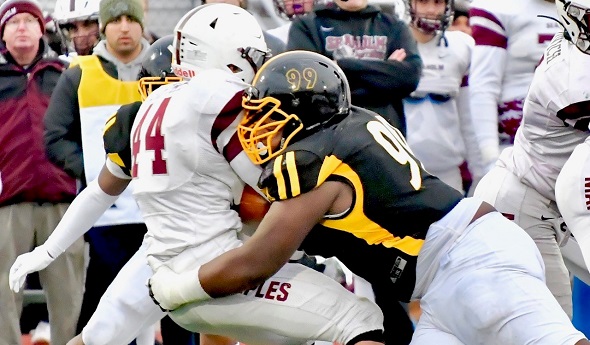 PHOTO: Detroit King's Terence Maize (99) wraps up Birmingham Seaholm's Chaz Strecker during the Crusaders' Division 2 Semifinal win Saturday. (Photo by Terry Lyons.)
