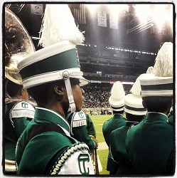 PHOTOS: (Top) Eight champions celebrated MHSAA titles over Friday and Saturday at Ford Field. (Click to see more from Terry McNamara Photography). (Middle top) Brother Rice players listen to their coaches during halftime of the Division 2 Final. (Middle) A Cass Tech band member prepares to take the field during the Division 1 Final. (Middle below) An Ithaca fan roots on his team in a costume made of Duck Tape, (Click to see more like the middle photos on the MHSAA Instagram page.)