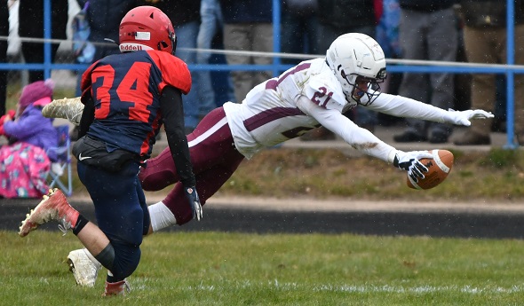 PHOTO: After breaking a couple of tackles and almost getting pushed out of bounds, Menominee's Keagan Moore dives for the end zone and scores. (Photo by Cara Kamps.)