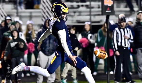 PHOTO: Clarkston’s punter winds up to send the ball back to Lake Orion during last week’s Division 1 District win. (Photo by Terry Lyons.)